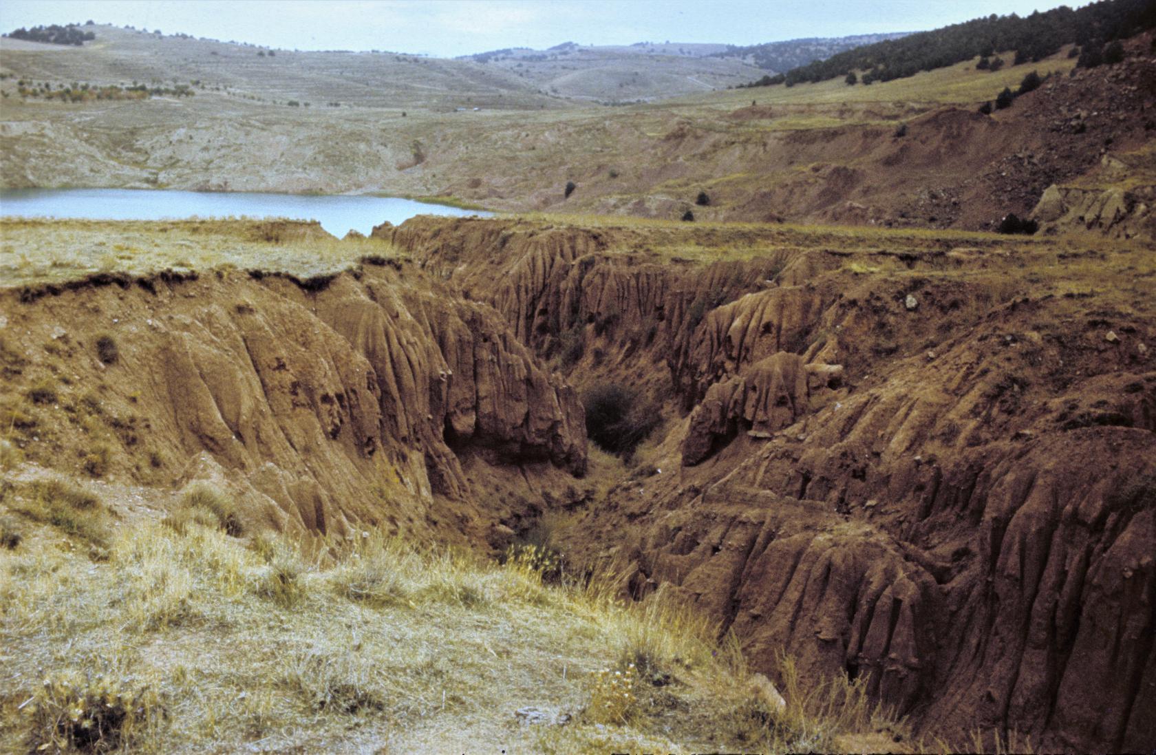Выходим на обрывы по западному краю плато. Внизу наблюдаем хаотически всхолмленную местность. Слева (на ЮЗ) видно строительство водохранилища.