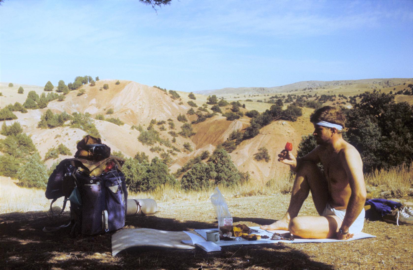 Козьим ходом поднимаемся метров на 150 и попадаем на террасу за гребнем. Ночуем в уютной пыльной ложбинке между грядами.