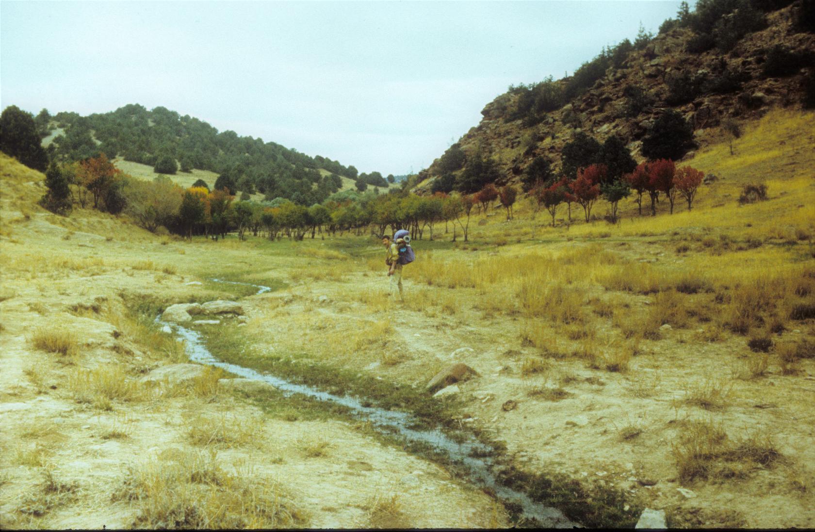 От дороги спускаемся вдоль речки к Пачкамарскому водохранилищу. Внизу оказываемся среди обширных, на редкость неуютных,